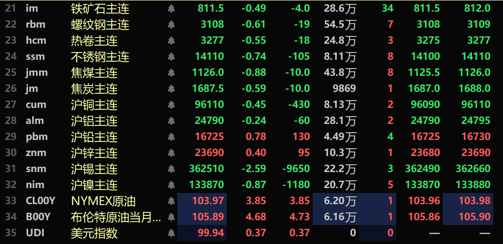 黑色系均飘绿,铁矿跌0.49%,螺纹跌0.61%,热卷跌0.55%,不锈钢跌0.74%。双焦方面:焦煤主力合约跌0.88%,焦炭主力合约跌0.59%。