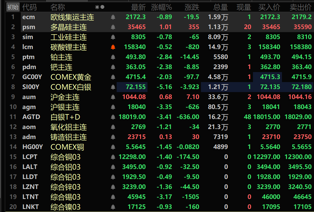 此外,铸造铝主连期货涨0.13%,氧化铝主连跌1.21%。碳酸锂主连跌0.52%。工业硅主连跌0.78%。多晶硅主连涨1.01%。