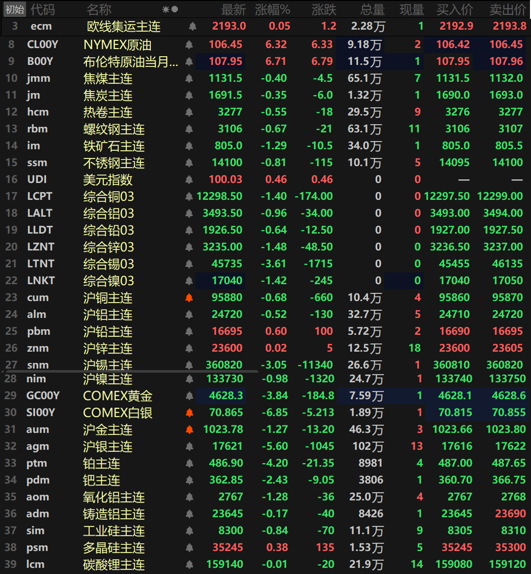 此外,碳酸锂主连跌0.01%,多晶硅主连涨0.38%,工业硅主连跌0.84%。欧线集运主连涨0.05%报2193。