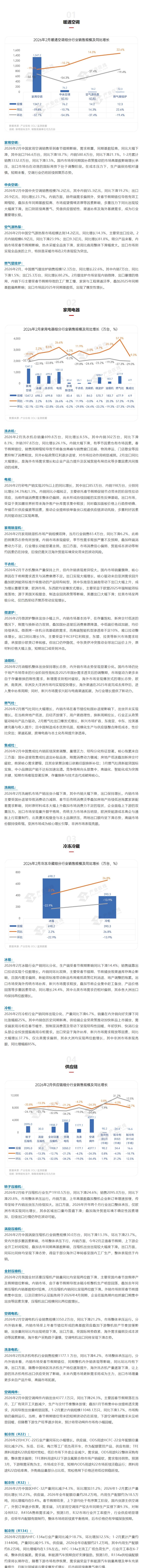 产业在线最新月度产销汇总数据显示,2026年2月受春节假期错位影响,环比除制冷剂之外全线下滑,同比涨跌互现。其中内销市场大多数行业都是同环比下滑,出口市场影响相对较小,部分产品还实现了较高增长。整机市场表现好于供应链市场。