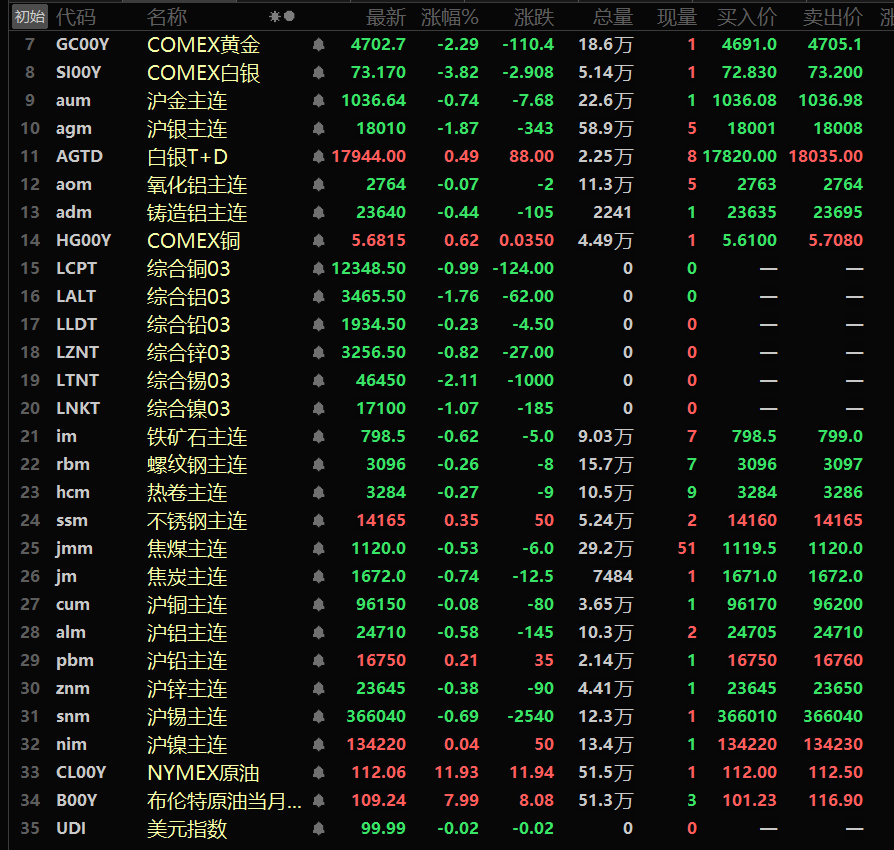 隔夜两油期货均飙升,美油涨11.93%,美油收涨至110美元上方,为2022年以来首次;布油涨7.99%。特朗普全国电视讲话释放强硬信号,令市场押注战事快速结束的空头头寸迅速平仓反转,是此番油价飙升的直接导火索。国际能源署已将此次危机定性为"油市史上最严峻的供应冲击",而其持续时间目前仍难以预判。(华尔街见闻)