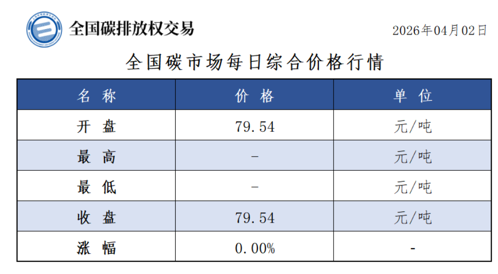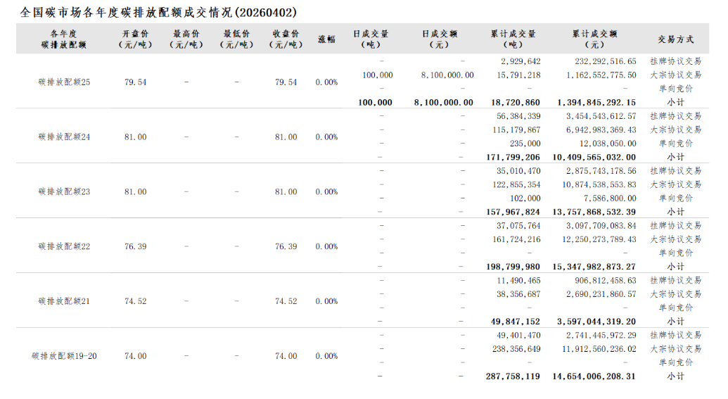 2026年1月1日至4月2日,全国碳市场碳排放配额成交量20,026,621吨,成交额1,498,694,025.75元。