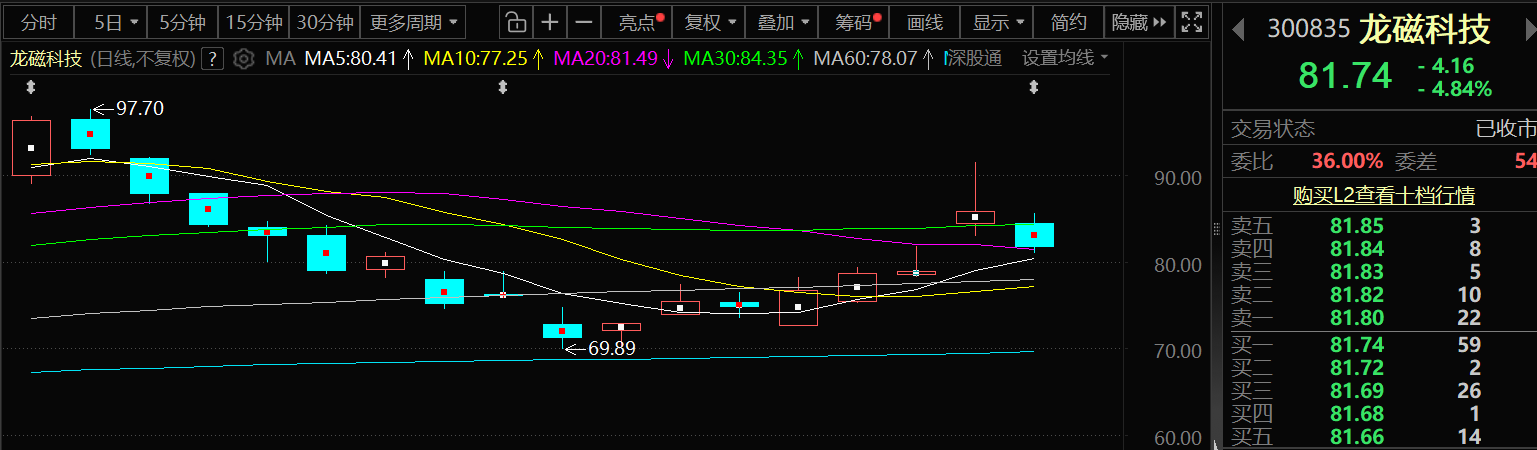 4月2日,龙磁科技股价出现下跌,截至2日收盘,龙磁科技跌4.84%,报81.74元/股。