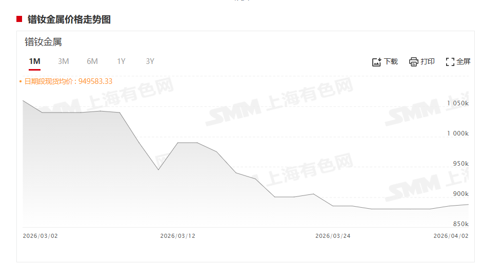 据SMM报价显示:4月2日,SMM镨钕金属价格为880000~895000元/吨,其均价为887500元/吨,较前一交易日上涨0.28%。