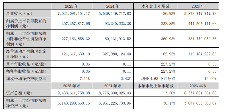 正海磁材发布的2025年年报显示:2025年,公司实现营业总收入703,109.12万元,同比增长26.93%;实现归属于公司股东的净利润30,735.78万元,同比增长232.85%;实现基本每股收益0.36元,同比增长227.27%。