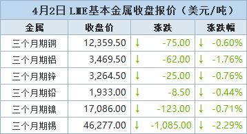 伦敦时间4月2日17:00(北京时间4月3日00:00),LME三个月期铜下跌75美元,或0.6%,收报每吨12,359.50美元。这一被视为全球经济风向标的金属,此前曾连续四个交易日上涨,在因复活节假期而缩短的本周累计上扬1.35%。