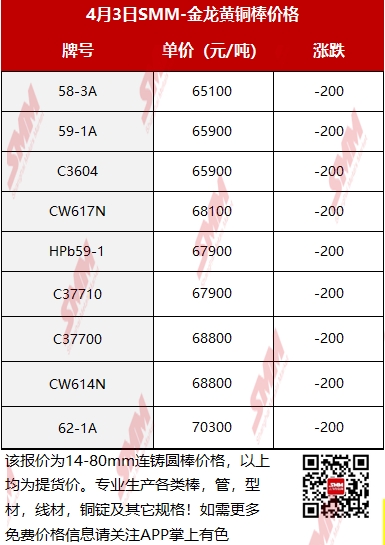【SMM价格】2026年4月3日金龙黄铜棒价格