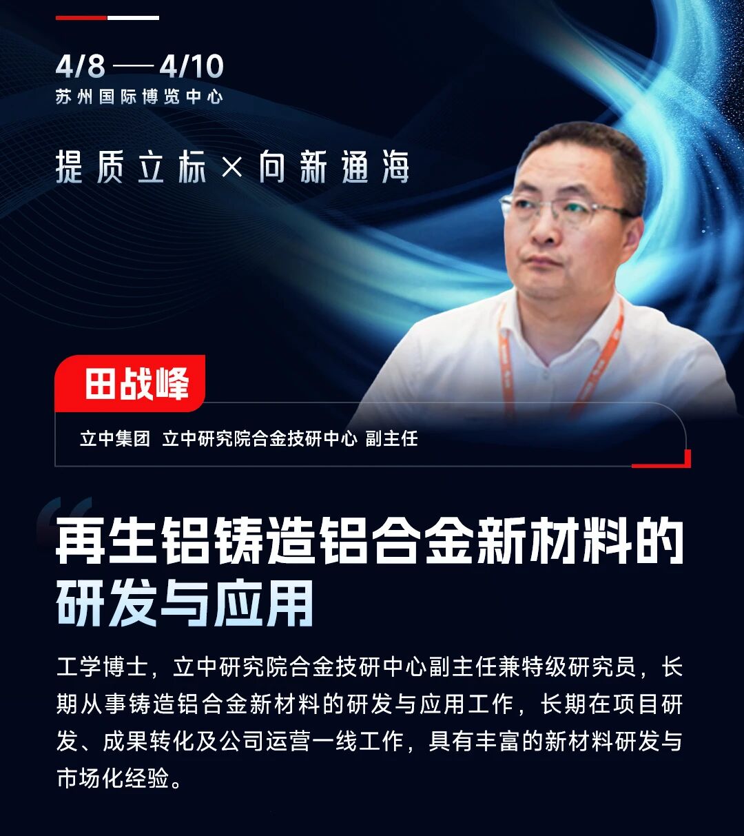 田战峰先生作为工学博士及特级研究员,长期扎根铸造铝合金新材料研发与应用一线,在项目攻坚、成果转化及产品市场化领域积累了丰富经验,始终以技术创新推动再生铝产业提质升级。
