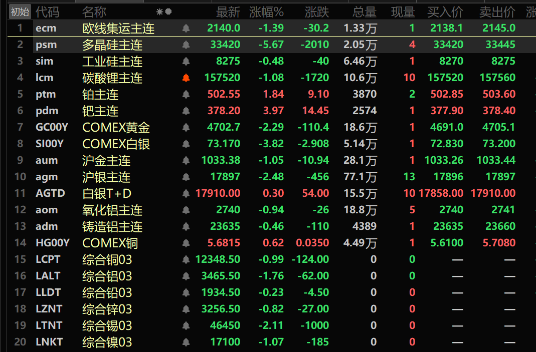 此外,截至午间收盘,铂主连期货涨1.84%,钯主连期货涨3.97%。