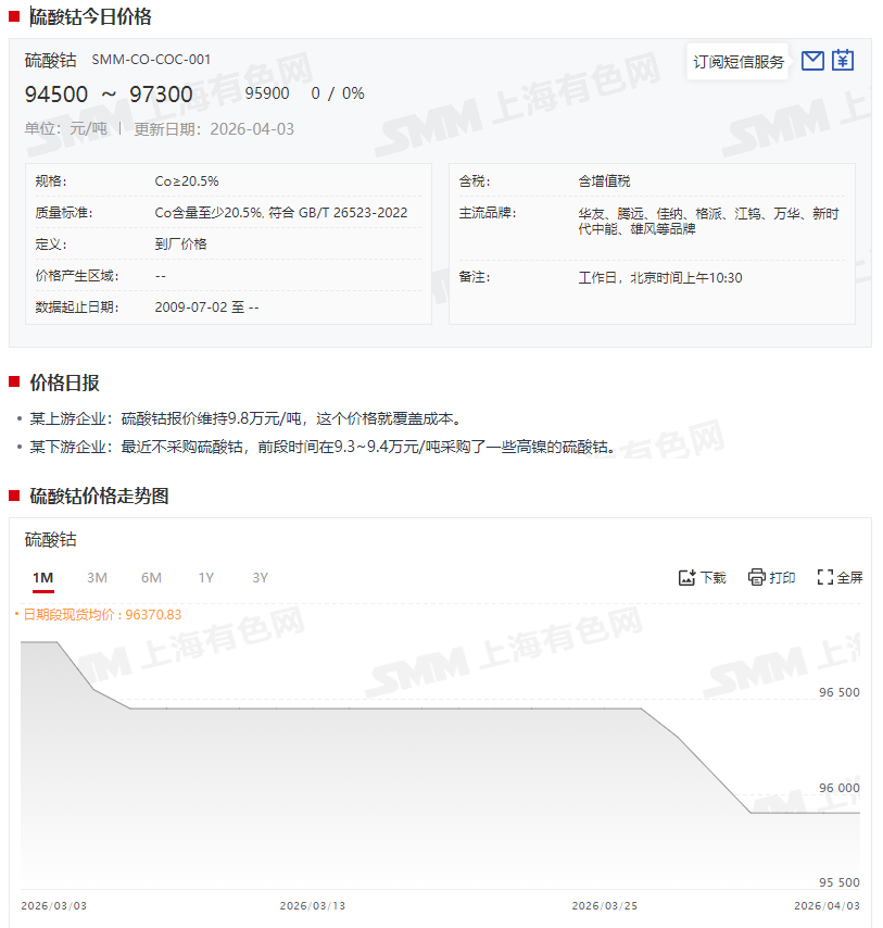 据SMM现货报价显示,本周硫酸钴现货报呈现窄幅震荡的态势,截至4月3日,硫酸钴现货报价维持在94500~97300元/吨,均价报95900元/吨,较3月27日小幅下跌400元/吨。