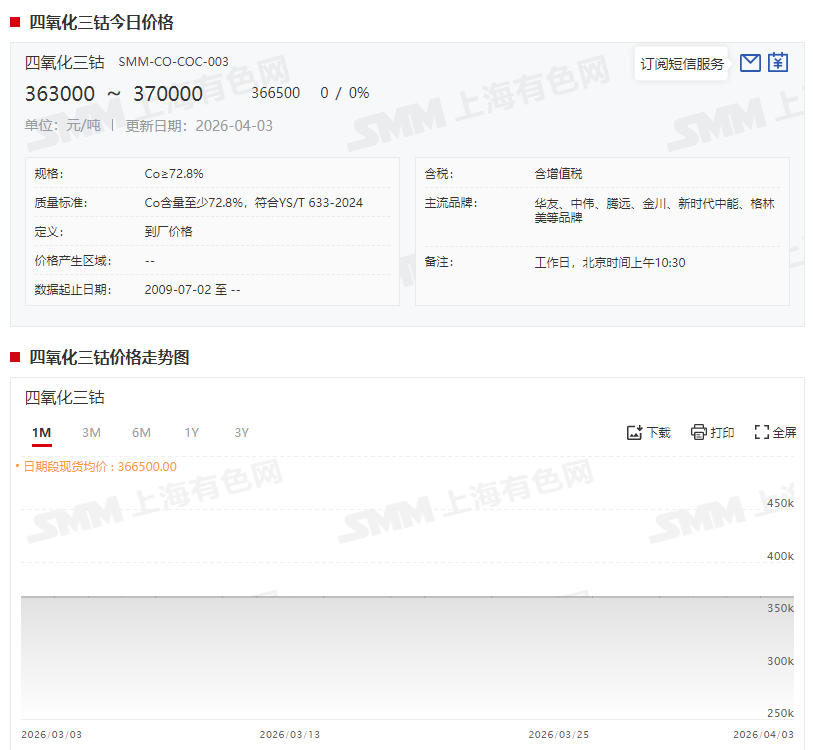 据SMM现货报价显示,本周四氧化三钴现货报价同样维持稳定,截至4月3日,四氧化三钴现货报价36.3~37元/吨,均价报36.65元/吨。