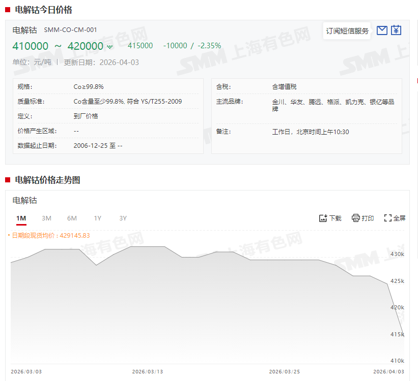 据SMM现货报价显示,本周电解钴现货报价受资金及宏观情绪方面等因素影响,呈现阴跌态势,截至4月3日,电解钴现货报价跌至41~42万元/吨,均价报41.5万元/吨,较3月27日的42.95万元/吨下跌1.45万元/吨,跌幅达3.38%。