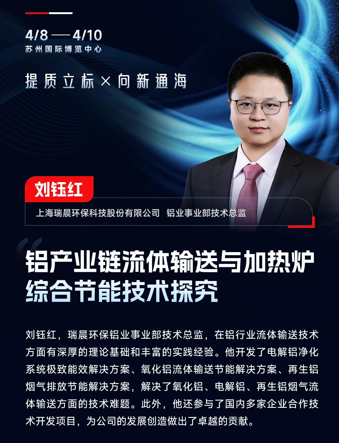 在此背景下,SMM AICE(第二十一届)铝业大会暨铝产业博览会特邀上海瑞晨环保科技股份有限公司铝业事业部技术总监刘钰红先生,于2026年4月8日进行《铝产业链流体输送与加热炉综合节能技术探究》专题发言。