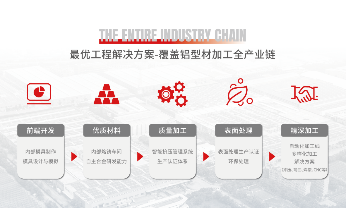 齐力澳美产业链涵括合金研发、模具设计与开发、铝棒熔铸、型材挤压、表面处理以及精深加工等模块,提供一站式的铝合金解决方案。