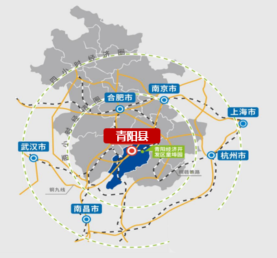 从区位交通来看,青阳是长江经济带重要节点城市,也是长三角城市群中心区城市,机场、高铁、铁路、高速、港口应有尽有,县城距离高铁站、高速下口仅3公里,距离九华山机场20公里,武温高铁、宁安城际、沿江高速、318国道横贯东西,京台高速、330国道贯穿南北,童埠港水运直通长江深水港,且常年通航,2-3小时通勤圈覆盖合肥、南京、上海、杭州、南昌、武汉等长三角及中部地区各大城市。