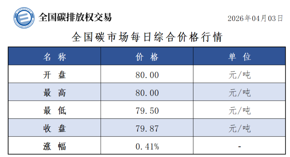 今日全国碳市场综合价格行情为: 开盘价80.00元/吨,最高价80.00元/吨,最低价79.50元/吨,收盘价79.87元/吨,收盘价较前一日上涨0.41%。