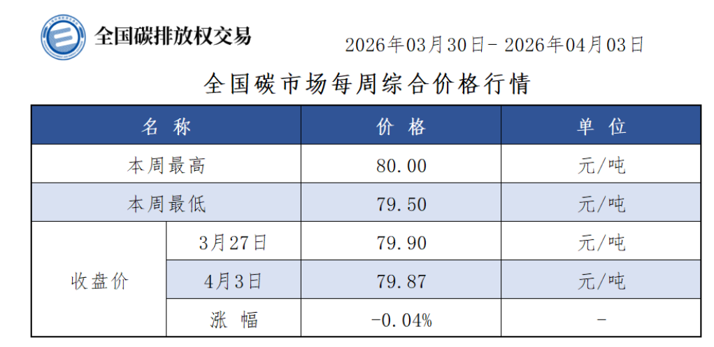 本周全国碳市场综合价格行情为:最高价80.00元/吨,最低价79.50元/吨,收盘价较上周五下跌0.04%。