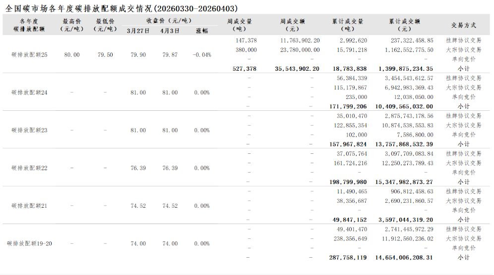 2026年1月1日至4月3日,全国碳市场碳排放配额成交量20,089,599吨,成交额1,503,723,967.95元。
