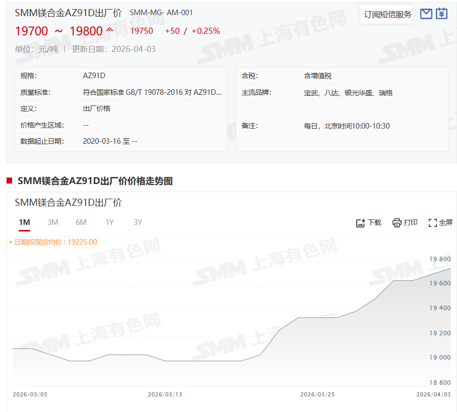 SMM镁合金AZ91D出厂价4月3日的价格为19700~19800元/吨,其均价为19750元/吨,与前一交易日涨0.25%。