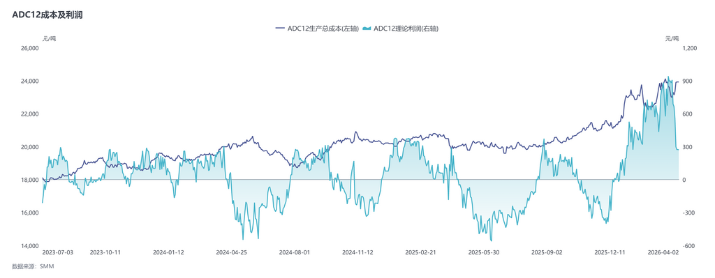 成本方面,据SMM最新数据显示,3月ADC12行业理论总成本抬升至23,560元/吨,较2月环比增加4.7个百分点。从成本结构看,单吨废铝成本上行至21,344元,占比小幅提升至90.6%,仍为绝对主导成本;受铜价重心下移影响,单吨铜成本回落至826元,占比降至3.5%;单吨硅成本亦小幅下滑至484元,占比为2.1%。整体来看,在铝价上移及合规货源价格抬升的带动下,废铝价格跟涨较快,推动其成本占比进一步提升。同期行业ADC12理论利润约为694元/吨,行业整体仍维持在盈利区间。进入4月,废铝仍将是驱动ADC12成本波动的核心因素,其价格走势将紧密跟随原铝行情,同时受合规供给约束的影响,预计4月行业成本大概率维持高位区间震荡。