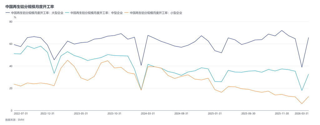 供应方面,3月再生铝合金行业开工率录得53.8%,环比大幅回升22.4个百分点,同比小幅下滑1.3个百分点。元宵节后企业普遍完成复工复产,叠加下游需求同步修复、新订单持续回暖,推动开工率显著提升。但回升力度仍受多重因素制约:4月成本压力短期难以缓解,终端需求修复力度存疑,预计行业订单将有所走弱,开工率较3月稳中小幅回落。