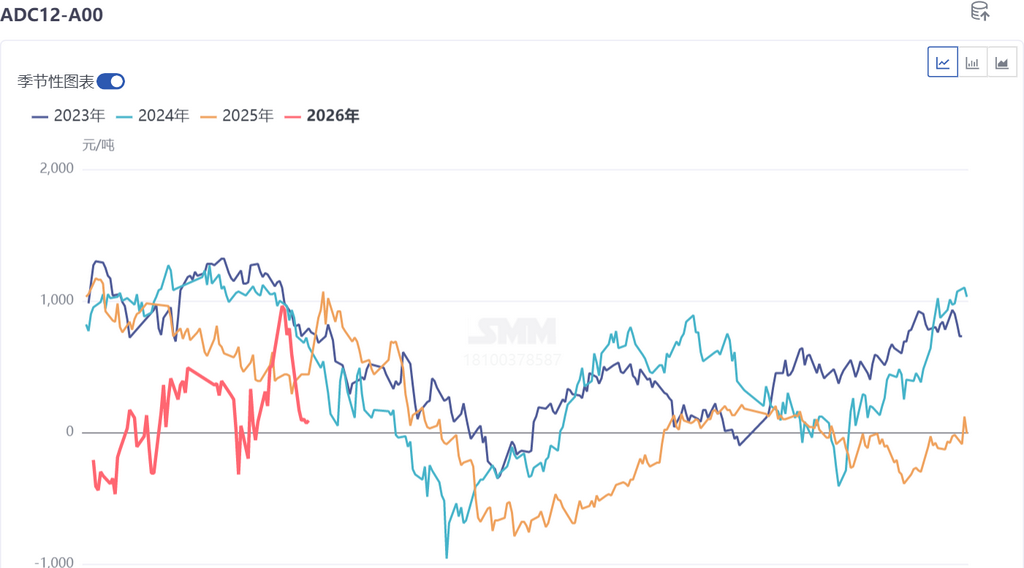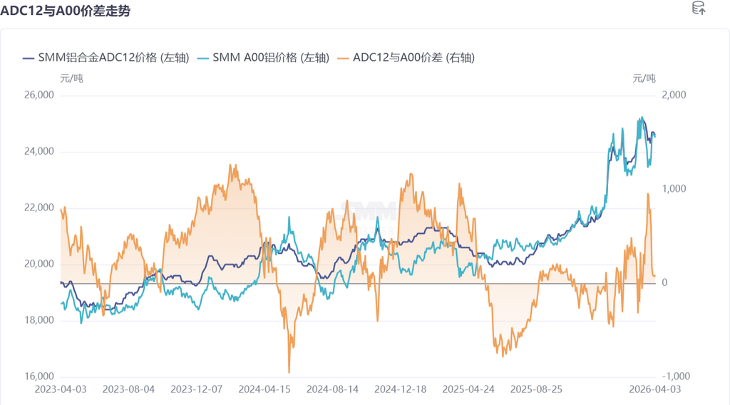 现货方面:3月初铝价走强带动ADC12快速上行,中下旬受铝价回落及需求转弱拖累震荡下行,月末小幅反弹。截至4月3日,SMM ADC12报24600元/吨,较3月初累计上涨700元/吨。价差方面,中旬后A00铝价回落,ADC12受成本支撑跌幅相对有限,价差一度走扩;月末A00受中东扰动带动反弹,但ADC12需求转弱、跟涨乏力,价差快速收窄,目前已回落至100元/吨以内,处于同期相对低位。