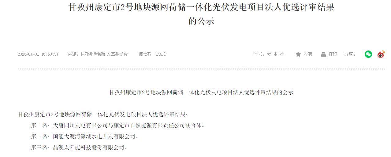 根据公示,3家企业入选,第一名大唐四川发电有限公司与康定市自然能源有限责任公司联合体,第二名国能大渡河流域水电开发有限公司,第三名晶澳太阳能科技股份有限公司。