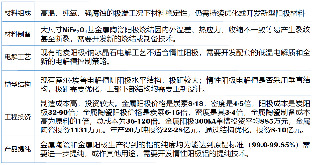 惰性阳极理论电耗高于炭阳极30-35%,对电网可能带来压力;需要其他技术降低吨铝能耗(更低过电位\更小的极距)。
