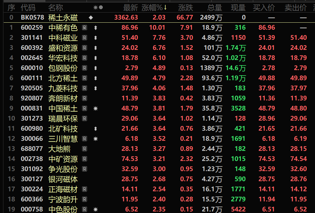 在经历了3月25日的小幅上涨,并持稳了三个交易日之后,镨钕现货价格自3月31日起迎来五连涨,目前持货商低价出货意愿降低,受现货价格持续上行的带动,叠加部分市场资金的流入等因素带动,稀土永磁概念股4月7日出现明显上涨。截至4月7日收盘,稀土永磁概念板块涨2.03%;个股方面,中稀有色涨停、中科磁业、盛和资源、华宏科技、包钢股份以及北方稀土等涨幅居前。