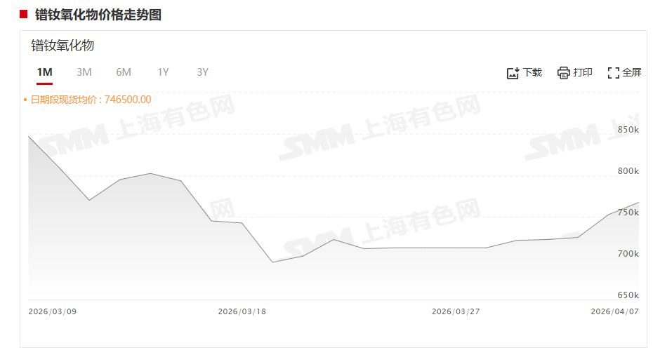 现货市场方面,近来氧化镨钕价格持续上涨。4月7日,氧化镨钕价格报765000~770000元/吨,其均价为767500元/吨,较其前一交易日涨1.99%。767500元/吨的均价与其3月24日的近期均价低点715000元/吨相比,其均价上涨了52500元/吨,涨幅为7.34%。