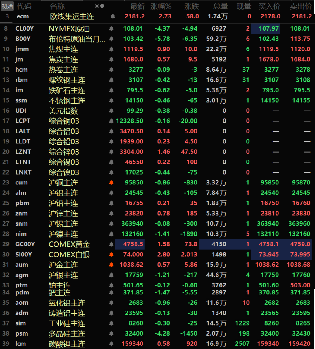 隔夜黑色系方面普跌,铁矿跌0.62%,不锈钢跌0.46%,螺纹跌0.42%。双焦方面,焦煤涨0.9%,焦炭涨0.57%。