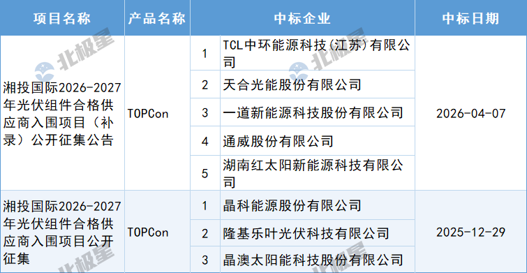 4月7日,湘投国际2026-2027年光伏组件合格供应商入围项目(补录)中标结果公示,中标企业有TCL中环能源科技(江苏)有限公司、天合光能股份有限公司、一道新能源科技股份有限公司、通威股份有限公司、湖南红太阳新能源科技有限公司。