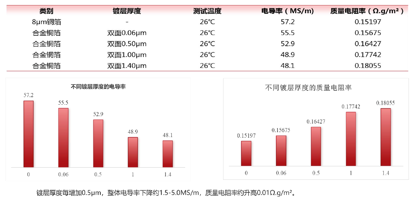 不同规格纯铜箔在电镀镍合金后,导电率下降4~5MS/m,质量电阻率升高0.012.g/㎡。