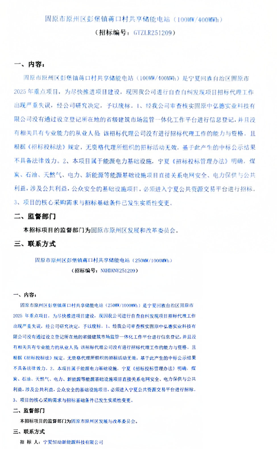 北极星储能网讯:2026年4月7日,固原市原州区彭堡镇蒋口村共享储能电站250MW/1000MWh、100MW/400MWh两个项目发布公告,因自查自纠发现项目招标代理工作出现产重失误,均予以废标。具体原因如下: