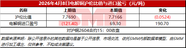 2026年4月8日电解铜沪伦比值与进口盈亏【SMM价格】