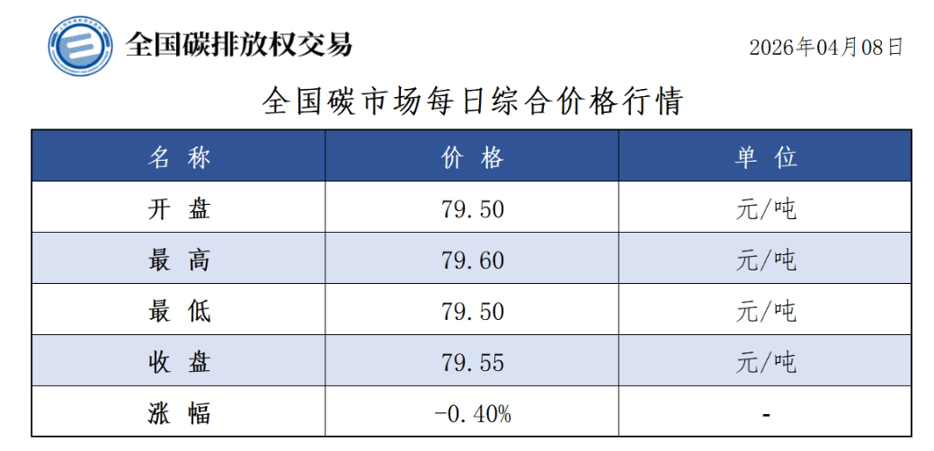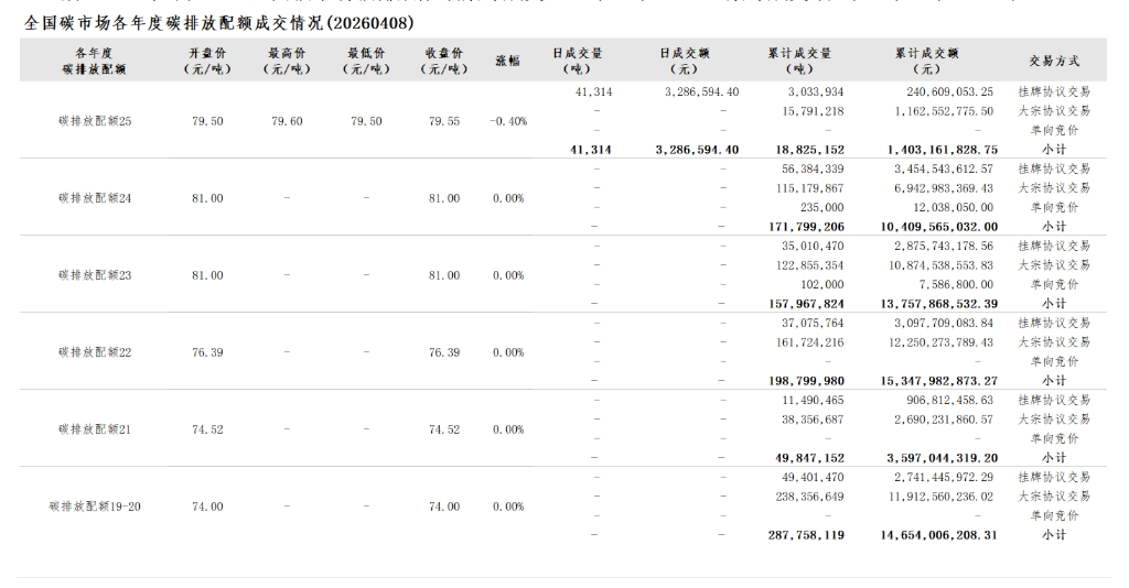 2026年1月1日至4月8日,全国碳市场碳排放配额成交量20,130,913吨,成交额1,507,010,562.35元。