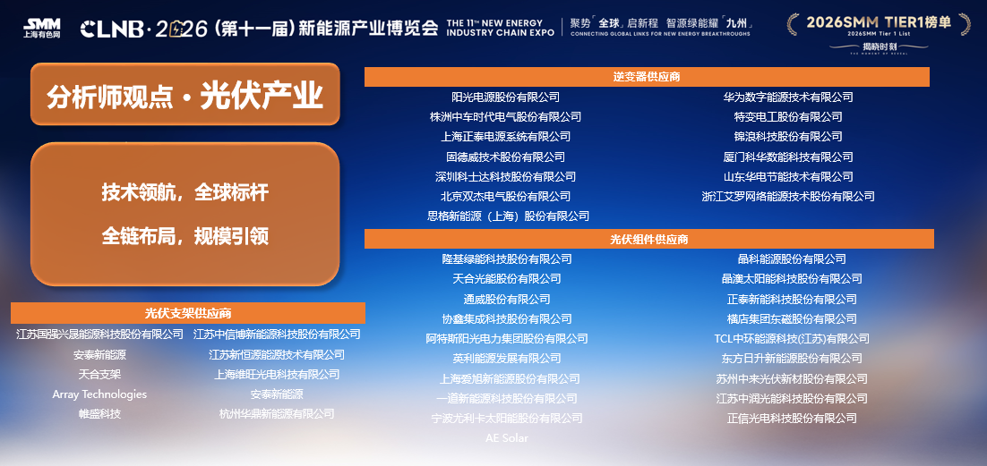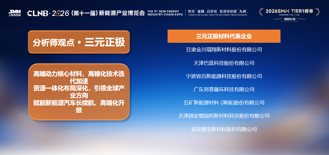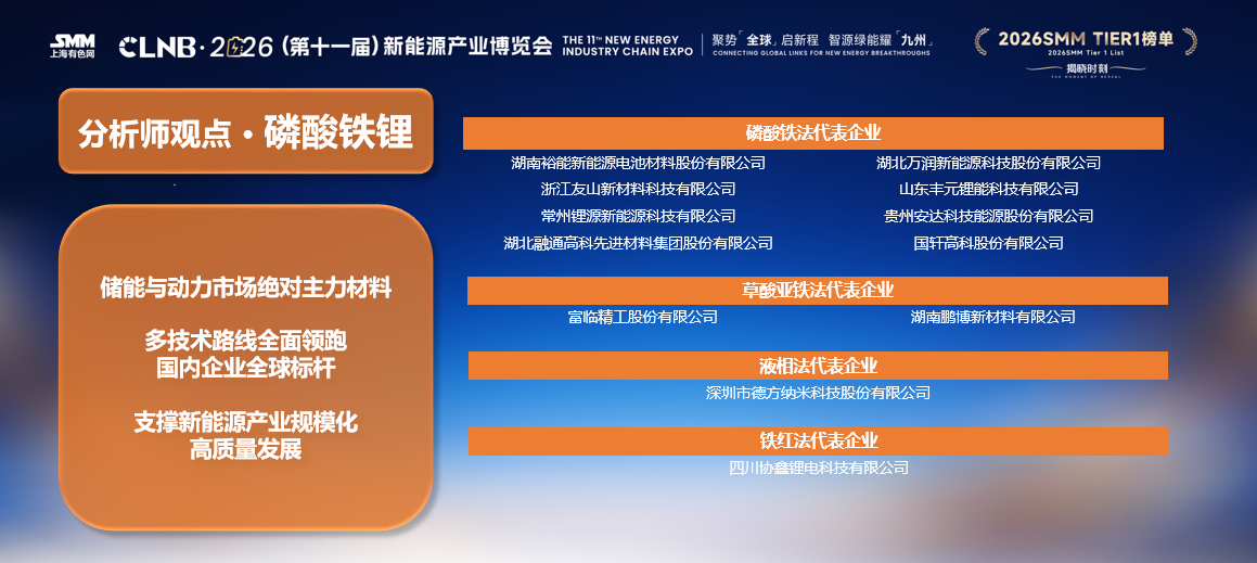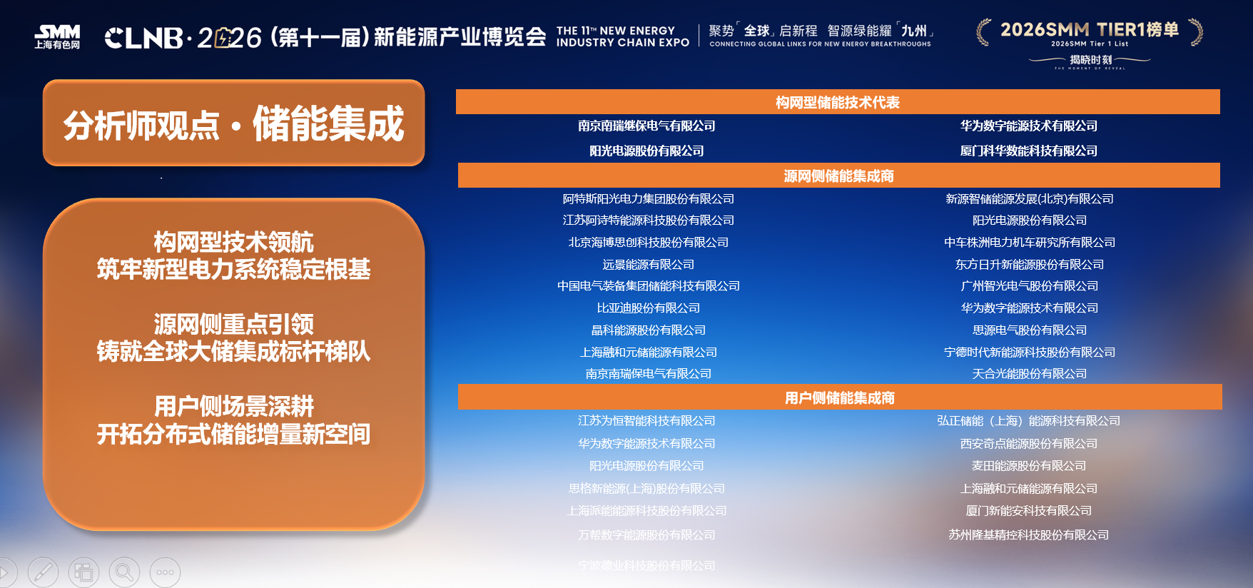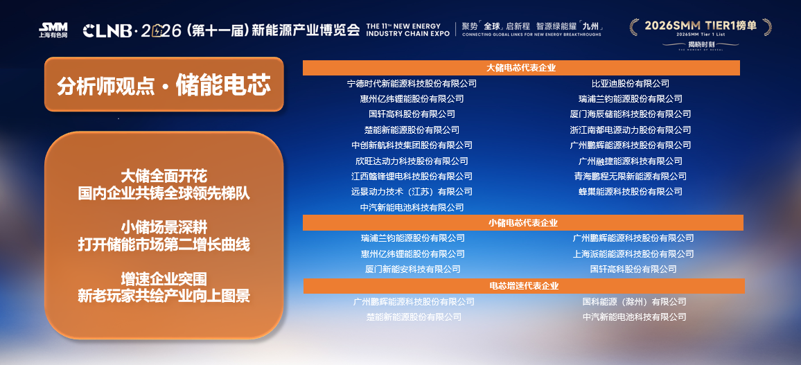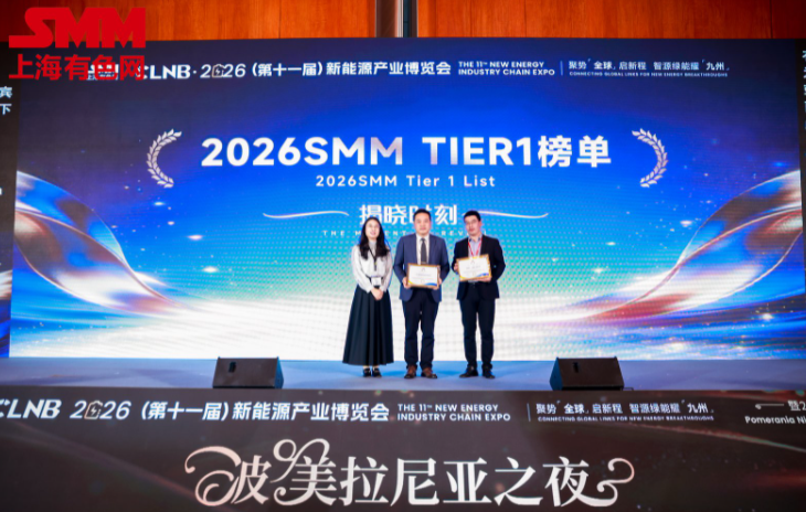 在由上海有色网信息科技股份有限公司(SMM)主办的2026 (第十一届)新能源产业博览会晚宴环节,2026年度SMM Tier1 榜单隆重揭晓!