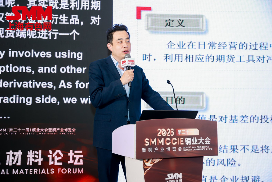 4月8日,在由上海有色网信息科技股份有限公司(SMM)、山东爱思信息科技有限公司、上海有色网金属交易中心有限公司主办,山东恒邦冶炼股份有限公司、Zambia Development Agency (ZDA)、中铝洛阳铜加工有限公司、和田商贸物流集团有限责任公司协办的2026 (第二十一届)SMM CCIE铜业大会暨铜产业博览会——电工材料论坛上,方正中期期货有限公司金牌分析师梁海宽分享了“铜产业链套期保值介绍与应用”。