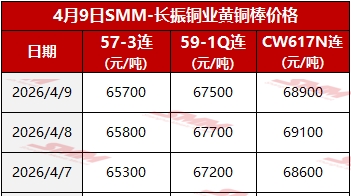 【SMM价格】2026年4月9日长振黄铜棒价格