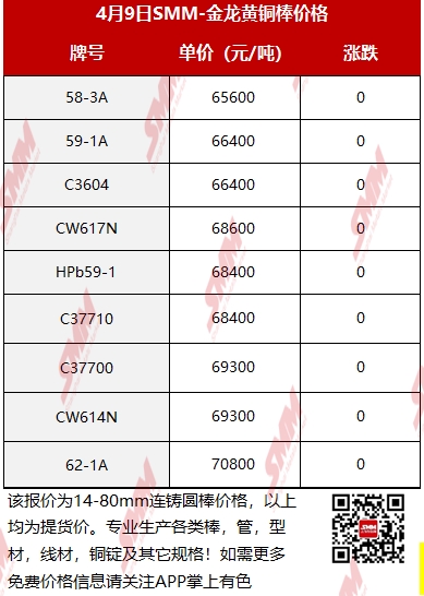 【SMM价格】2026年4月9日金龙黄铜棒价格