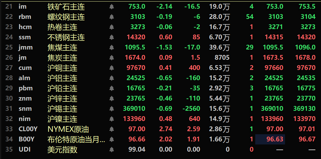 黑色系涨跌互现,铁矿跌2.14%,螺纹跌0.19%,热卷跌0.06%,不锈钢涨0.6%。双焦方面:焦煤主力合约跌1.53%,焦炭主力合约涨0.09%。