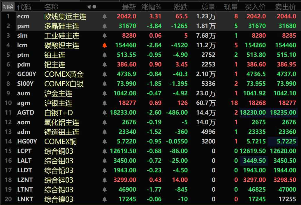 此外,铸造铝主连期货跌1.52%,氧化铝主连跌0.19%。碳酸锂主连跌2.84%。工业硅主连微涨。多晶硅主连跌3.84%。