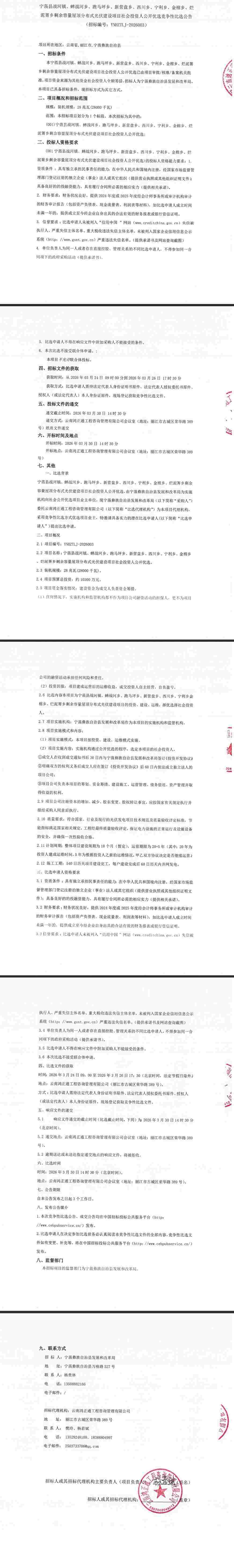 比选内容:本项目为宁蒗县战河镇、蝉战河乡、跑马坪乡、新营盘乡、西川乡、宁利乡、金棉乡、烂泥乡剩余容量屋顶分布式光伏建设项目的投资、建设、运维,择优选择社会投资人。