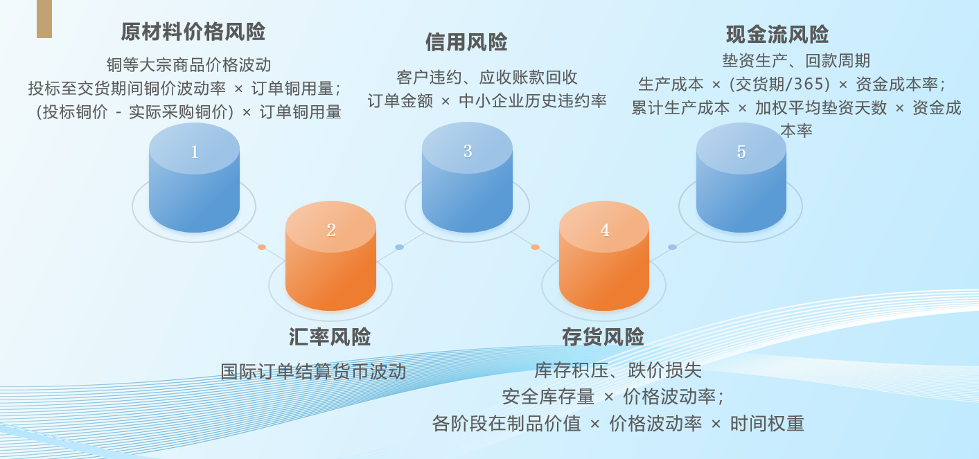 风险敞口:原材料(核心)、信用、现金流(核心)、存货。