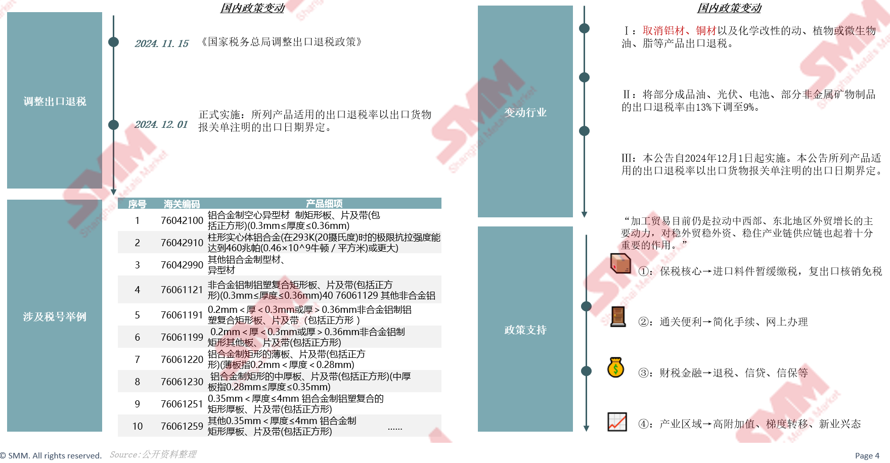 据SMM了解,2024年11月15日,国家财政部发布《关于调整出口退税政策的公告》,此次公告执行之后,12月1日后铜材加工企业出口不再享受退税,主要出口方式由一般贸易转为加工贸易。