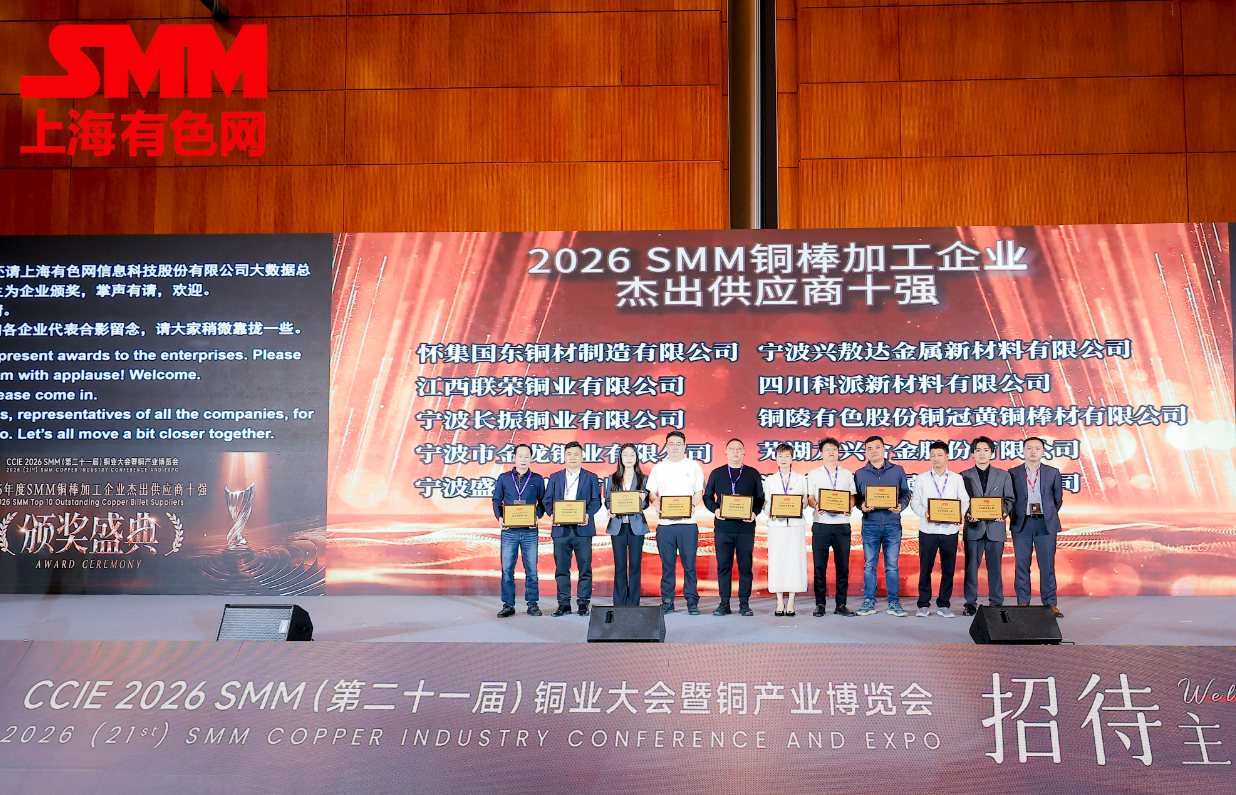 经过铜行业相关的主管领导、业界专家、上下游龙头及相关配套企业负责人等组成专家评审团评审,对获提名企业进行专家评分,同时结合线上投票结果、SMM企业评级模型线下评分等多个维度的评比,2026年度SMM铜棒加工企业杰出供应商十强名单正式揭晓!4月9日,在由SMM、山东爱思信息科技有限公司、上海有色网金属交易中心有限公司主办,山东恒邦冶炼股份有限公司、Zambia Development Agency (ZDA)、中铝洛阳铜加工有限公司、和田商贸物流集团有限责任公司协办,深圳市连接器行业协会、湖北省铜业协会、河南省有色金属行业协会、乐清市输配电行业协会、Women in Mining Africa (WiM-Africa)、清远市金属行业商会、宁波市电工电气行业协会、中国电子材料行业协会电子铜箔材料分会、江西省铜行业协会、中国硫酸工业协会特邀协办以及各赞助单位,各媒体支持单位大力支持的2026 (第二十一届)SMM CCIE铜业大会暨铜产业博览会上,举办了隆重的颁奖仪式。
