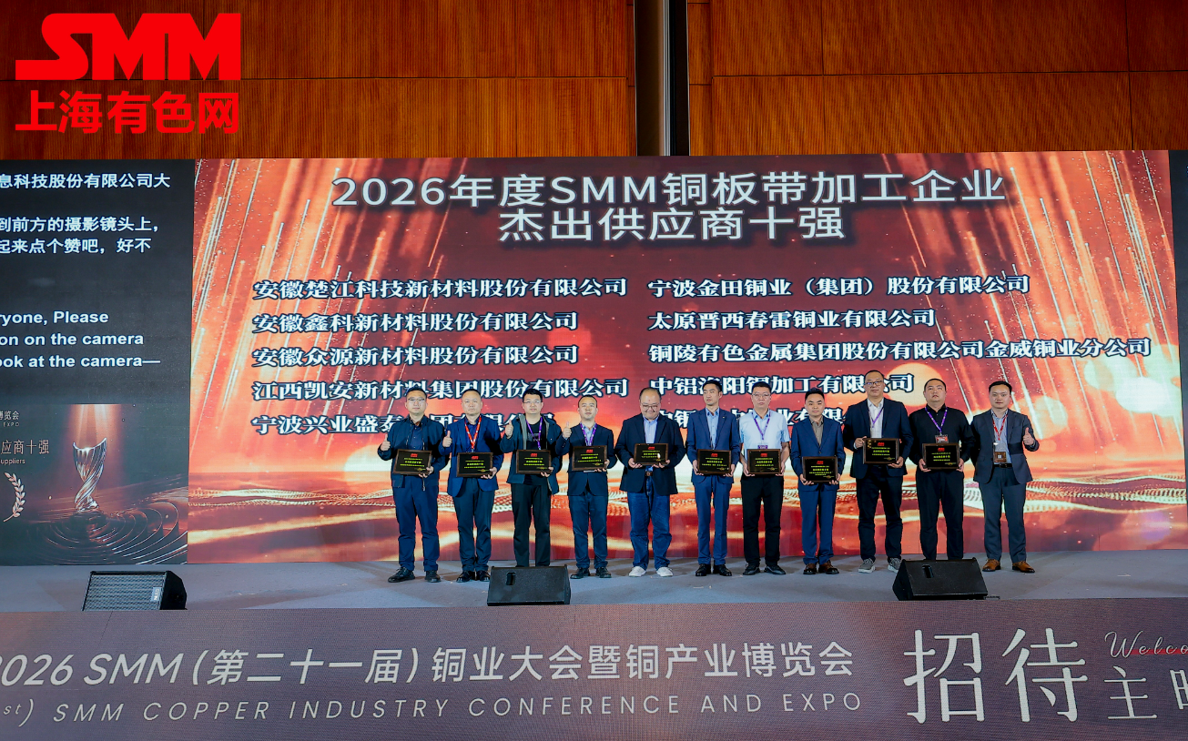 经过铜行业相关的主管领导、业界专家、上下游龙头及相关配套企业负责人等组成专家评审团评审,对获提名企业进行专家评分,同时结合线上投票结果、SMM企业评级模型线下评分等多个维度的评比,2026年度SMM铜板带加工企业杰出供应商十强名单正式揭晓!4月9日,在由SMM、山东爱思信息科技有限公司、上海有色网金属交易中心有限公司主办,山东恒邦冶炼股份有限公司、Zambia Development Agency (ZDA)、中铝洛阳铜加工有限公司、和田商贸物流集团有限责任公司协办,深圳市连接器行业协会、湖北省铜业协会、河南省有色金属行业协会、乐清市输配电行业协会、Women in Mining Africa (WiM-Africa)、清远市金属行业商会、宁波市电工电气行业协会、中国电子材料行业协会电子铜箔材料分会、江西省铜行业协会、中国硫酸工业协会特邀协办以及各赞助单位,各媒体支持单位大力支持的2026 (第二十一届)SMM CCIE铜业大会暨铜产业博览会上,举办了隆重的颁奖仪式。