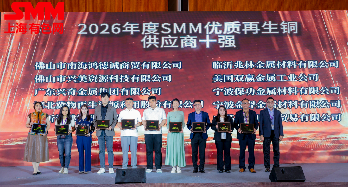 经过铜行业相关的主管领导、业界专家、上下游龙头及相关配套企业负责人等组成专家评审团评审,对获提名企业进行专家评分,同时结合线上投票结果、SMM企业评级模型线下评分等多个维度的评比,2026年度SMM优质再生铜供应商十强名单正式揭晓!4月9日,在由SMM、山东爱思信息科技有限公司、上海有色网金属交易中心有限公司主办,山东恒邦冶炼股份有限公司、Zambia Development Agency (ZDA)、中铝洛阳铜加工有限公司、和田商贸物流集团有限责任公司协办,深圳市连接器行业协会、湖北省铜业协会、河南省有色金属行业协会、乐清市输配电行业协会、Women in Mining Africa (WiM-Africa)、清远市金属行业商会、宁波市电工电气行业协会、中国电子材料行业协会电子铜箔材料分会、江西省铜行业协会、中国硫酸工业协会特邀协办以及各赞助单位,各媒体支持单位大力支持的2026 (第二十一届)SMM CCIE铜业大会暨铜产业博览会上,举办了隆重的颁奖仪式。