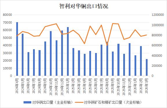 智利海关公布的数据显示,智利3月铜出口量为134,168吨,当月对中国出口铜22,234吨。智利3月铜矿石和精矿出口量为1,301,548吨,当月对中国出口铜矿石和精矿802,555吨。3月份智利对中国铜出口量出现回落,对华铜矿出口量略有回升。目前国内铜精矿现货加工费跌势扩大,矿紧局面难解。
