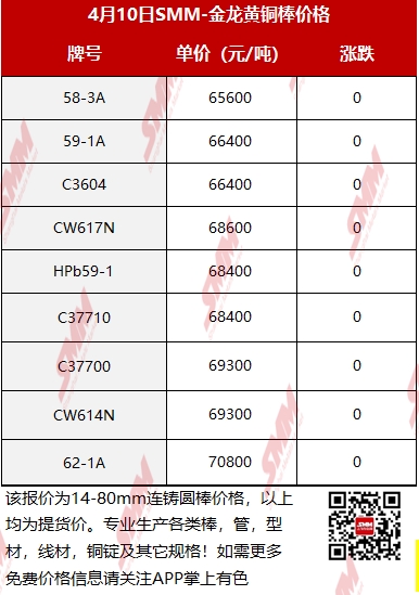 【SMM价格】2026年4月10日金龙黄铜棒价格